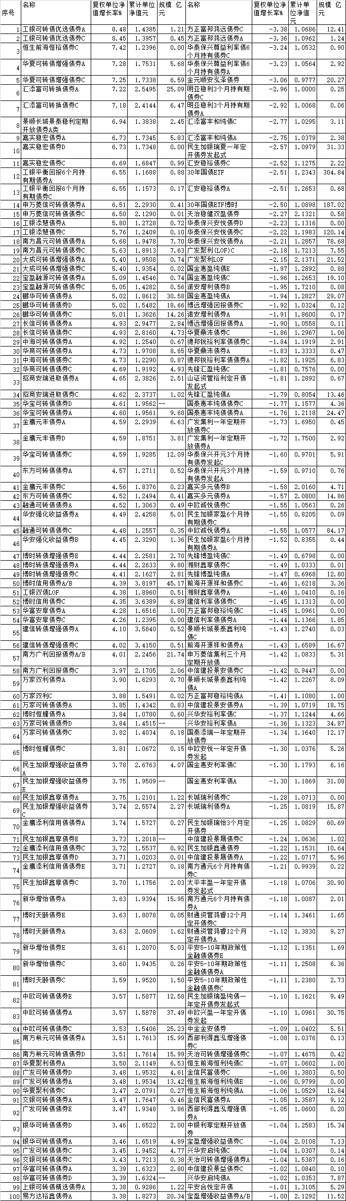 恒生前海恒裕债券C、华夏可转债增强债券A、华夏可转债增强债券C、汇添富可转换债券A、汇添富可转换债券C、景顺长城景泰稳利定期开放债券A类、嘉实稳宏债券A、嘉实稳宏债券D、嘉实稳宏债券C、工银平衡回报6个月持有期债券A、工银平衡回报6个月持有期债券C、申万菱信可转债债券A、申万菱信可转债债券C等众多债券型基金涨幅紧随其后,在9月份里均上涨了超过6%。