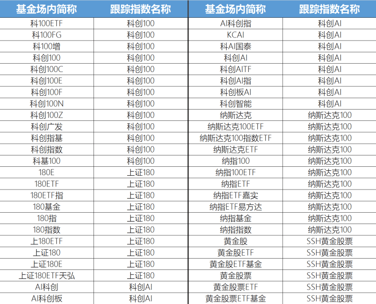 如跟踪上证180指数的ETF,成立于2006年4月13日的华安上证180ETF和成立于2025年1月15日的平安上证180ETF的扩位场内简称分别为“上证180ETF”和“上证180ETF指数基金”。