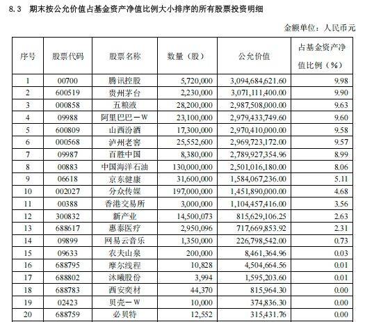 此外,该基金还以200%的幅度增持了香港交易所,持股增至300万股。下图是易方达蓝筹精选混合持仓图: