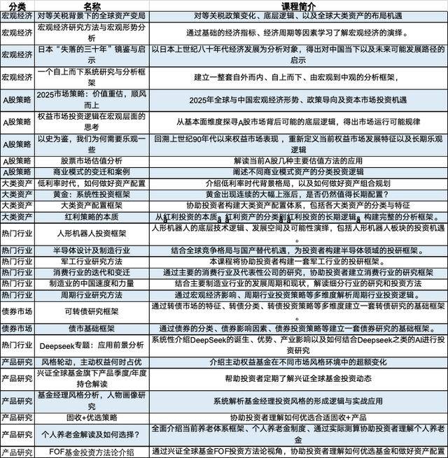 策略培训团队由来自买方与卖方领域的资深专业人士组成,核心成员毕业于伦敦政治经济学院、西安交通大学、上海交通大学等国内外知名高校,在权益、固收、宏观策略及产品研究分析上形成了扎实的专业分工。作为深嵌在销售条线的专业培训团队,所有研究均建立在以销售业务作为核心导向,“从业务中来,到业务中去”。基于“以客户为中心”的服务理念,团队综系统搭建了涵盖周度市场解读、定期持仓分析、专业投教课程、专题研究及市场异动点评在内的全周期投资服务体系。2025年6月,团队正式推出包含33门课程的“兴陪伴”体系,覆盖宏观经济、大类资产、行业研究等多维领域,并以此为基础展开深度赋能。